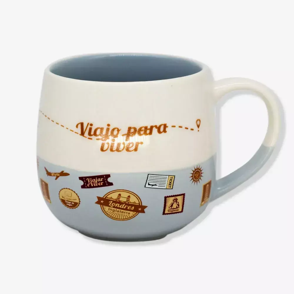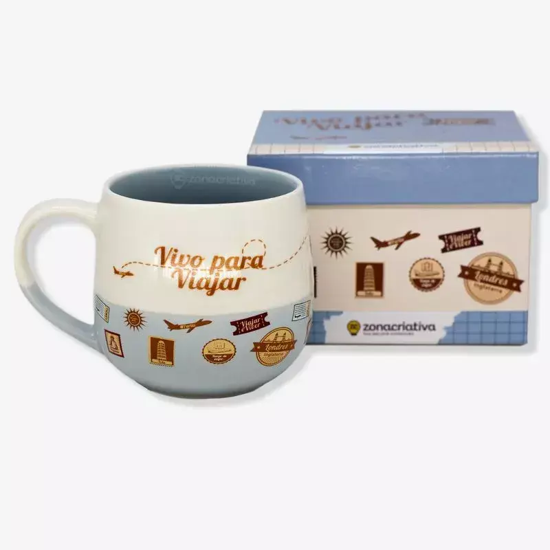 Com design exclusivo, traz a frase inspiradora “Vivo para Viajar” acompanhada de ícones de destinos e símbolos que remetem ao turismo e à descoberta de novos lugares. Produzida em cerâmica de alta qualidade, possui formato arredondado, ergonômico e confortável de segurar.